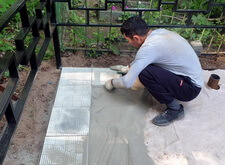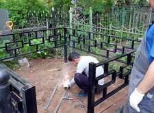 Приехав вновь на кладбище, мы взялись за очистку места захоронения от посторонних элементов: срезали болгаркой старое ограждение; пропололи сорную траву, а также разровняли землю, готовя её к покрытию бетонной плиткой.
