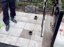 Согласно с ранее проработанным эскизом, цветники мы выкладываем брусчаткой. В середине каждого оставляем ничем не закрытую металлическую трубу: по задумке клиента трубы будут исполнять роль цветочных ваз, утопленных в землю. На этом же этапе окончательно укрепляем ограждение.