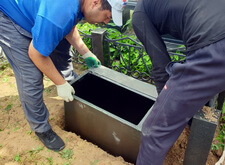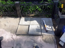 Первым делом мы взялись за установку саркофага: изготовив предварительно саркофаг, размещаем его на могиле под уровнем плитки. Предварительно территория места захоронения была полностью очищена от сорняка и прочего мусора.