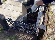 Переходим к завершающему этапу работы – заливаем ранее уложенную на пескобетон плитку водой. Это естественный катализатор, инициирующий превращение цемента в надёжный скрепляющий материал. Параллельно основной задаче, смываем водой образовавшуюся в ходе работ пыль с памятника и оградки.