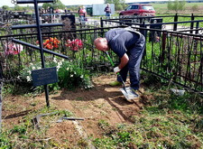Сорняка на могиле было действительно много, а потому управиться с ним быстро не получилось. Так или иначе мы удалили всю траву, выбросили мусор, дополнительно очистили ступенчатый цветник и протёрли крест.