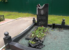 На нижеприведённых фотографиях представлен окончательный вид места захоронения. Мы поставили на место памятник, сделали цветник, уложили внутрь участка гранитную брусчатку. По периметру места захоронения проходит старый цоколь, на этот раз укреплённый на надёжное и добротное основание. В правую половину участка высадили две туи (одну в специальную клумбу, другую в пластиковую кадку), в цветник поместили барвинок. В таком виде объект был представлен клиенту, который остался очень доволен проделанной работой.